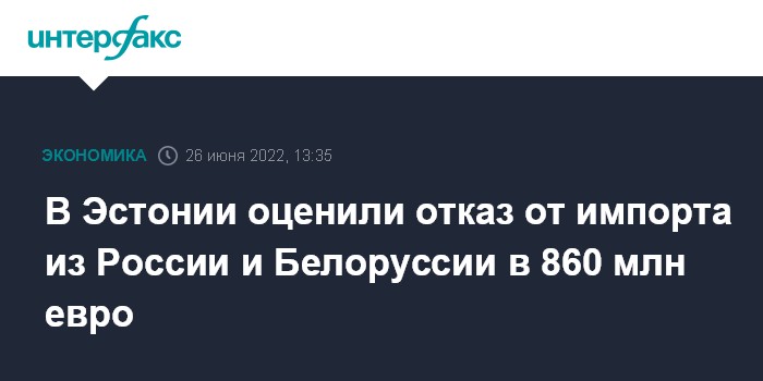 Москва. 26 июня. INTERFAX.RU - Отказ от импорта из России и Белоруссии больше всего скажется на логистике, металлургической и деревообрабатывающей сферах экономики Эстонии.