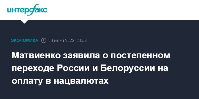 Москва. 26 июня. INTERFAX.RU - Россия и Белоруссия все в большей мере переходит на оплату в национальных валютах, заявила председатель Совета Федерации России Валентина Матвиенко.