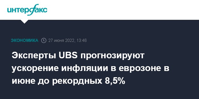 Москва. 27 июня. INTERFAX.RU - Инфляция в еврозоне в июне ускорилась до рекордных 8,5% в годовом выражении по сравнению с 8,1% в мае, прогнозируют эксперты UBS.