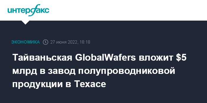 Москва. 27 июня. INTERFAX.RU - Тайваньская GlobalWafers планирует инвестировать $5 млрд в строительство завода в американском штате Техас.
