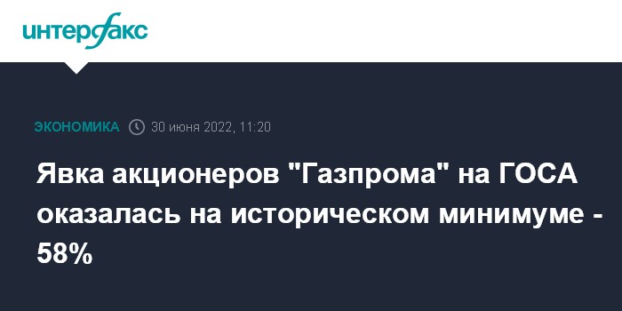 Москва. 30 июня. INTERFAX.RU - Акционеры "Газпрома" на годовом собрании по итогам 2021 года снизили явку до 58%, что является минимальным значением за историю акционерного общества, следует из протокола голосования на собрании.