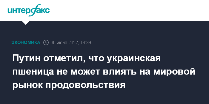Москва. 30 июня. INTERFAX.RU - Доля украинского продовольствия, в том числе пшеницы, на мировом рынке слишком мала для того, чтобы влиять на глобальную ситуацию с продовольствием, заявил президент РФ Владимир Путин.