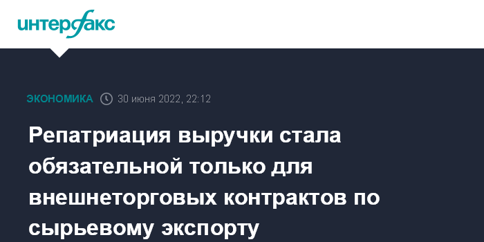 Москва. 30 июня. INTERFAX.RU - Требование об обязательной репатриации на счета в уполномоченных банках иностранной валюты вновь распространяется только на внешнеторговые контракты по сырьевому экспорту.