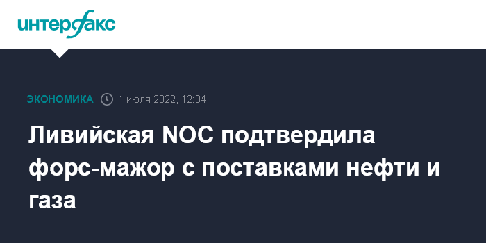 Москва. 1 июля. INTERFAX.RU - Ливийская нефтегазовая корпорация (NOC) подтвердила объявление форс-мажора на терминалах Асидра и Рас-Лануф и месторождении Аль-Фил, с сохранением форс-мажора на терминалах Брега и Зуейтина.