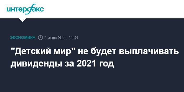 Москва. 1 июля. INTERFAX.RU - Акционеры ПАО "Детский мир" по итогам годового собрания приняли решение не распределять чистую прибыль по итогам 2021 года и не выплачивать дивиденды, говорится в сообщении компании.