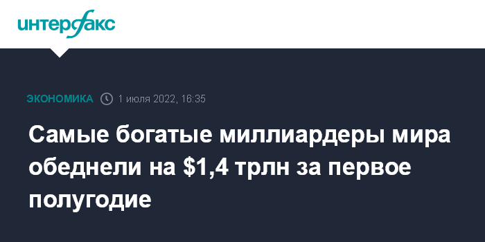 Москва. 1 июля. INTERFAX.RU - Состояние 500 самых богатых людей мира упало на $1,4 трлн за первое полугодие 2022 года на фоне резкого обвала глобальных фондовых рынков, пишет в пятницу агентство Bloomberg.