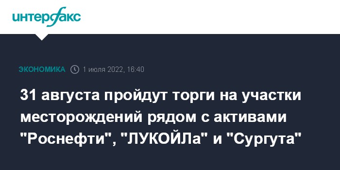 31 августа пройдут торги на участки месторождений рядом с активами "Роснефти", "ЛУКОЙЛа" и "Сургута"