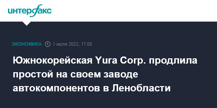 Москва. 1 июля. INTERFAX.RU - ООО "Йура Корпорейшн Рус" (российский филиал южнокорейской Yura Corp.) продлило приостановку работы своего завода по производству автомобильных комплектующих в Ивангороде (Ленинградская область) до 31 июля 2022 года, сообщили "Интерфаксу" в пресс-службе губернатора и правительства региона.