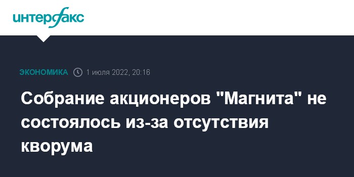 Москва. 1 июля. INTERFAX.RU - Годовое собрание акционеров ПАО "Магнит" не состоялось из-за отсутствия кворума, говорится в сообщении компании.