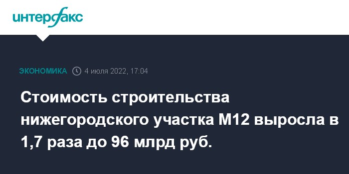Стоимость строительства нижегородского участка М12 выросла в 1,7 раза до 96 млрд руб.