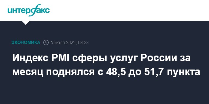 Москва. 5 июля. INTERFAX.RU - Индекс PMI сферы услуг России в июне 2022 года составил 51,7 пункта, поднявшись с майского значения 48,5 пункта, свидетельствуют материалы исследования S&P Global.