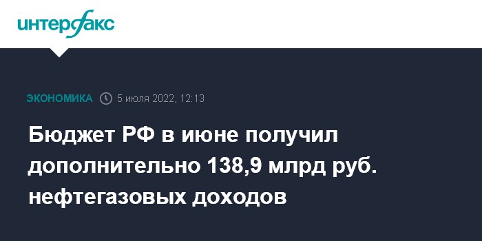 Бюджет РФ в июне получил дополнительно 138,9 млрд руб. нефтегазовых доходов