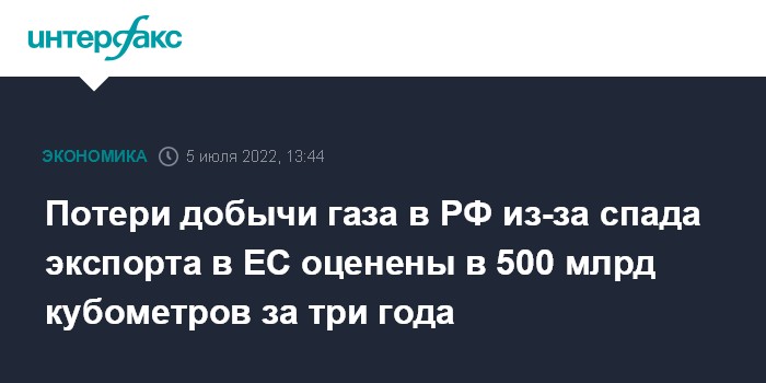 Москва. 5 июля. INTERFAX.RU - Совокупные потери добычи газа в России в 2022-2025 годах могут превысить 480 млрд куб. м на фоне санкций и решения Евросоюза об отказе от российского топлива, говорится в ежеквартальном отчете Международного энергетического агентства о рынке газа.