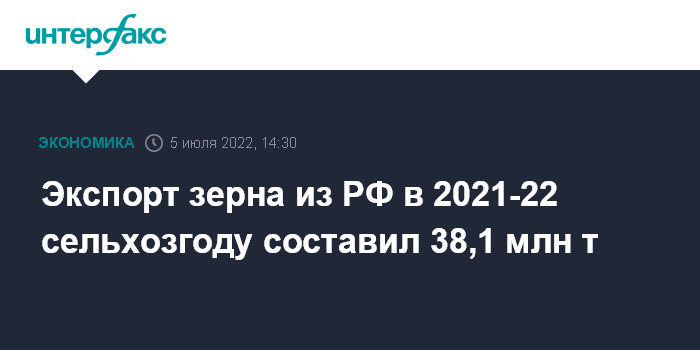 Москва. 5 июля. INTERFAX.RU - Экспорт зерна из РФ в 2021-2022 сельхозгоду составил 38,1 млн тонн. Об этом сообщила пресс-служба Минсельхоза со ссылкой на данные ФТС.