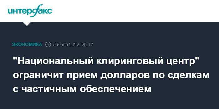 Москва. 5 июля. INTERFAX.RU - "Национальный клиринговый центр" (НКЦ) с 18 июля ограничивает прием долларов США в качестве валюты обеспечения исполнения обязательств по сделкам с частичным обеспечением, сообщил сайт "Московской биржи".