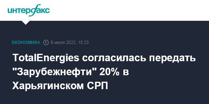 "В соответствии с нашими принципами поведения, изложенными 22 марта в отношении нашего выхода из российского нефтяного бизнеса, а также после передачи роли оператора "Зарубежнефти" и снижения нашей доли с 40% до 20% в 2016 году, TotalEnergies согласилась передать "Зарубежнефти" оставшиеся 20% доли участия в Харьягинском нефтяном месторождении. Эта сделка подлежит одобрению российскими властями", - говорится в сообщении компании.