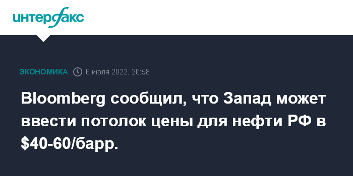 Москва. 6 июля. INTERFAX.RU - США с их союзниками обсуждают возможность введения потолка для стоимости российской нефти в пределах $40-60 за баррель, передает Bloomberg со ссылкой на осведомленные источники.
