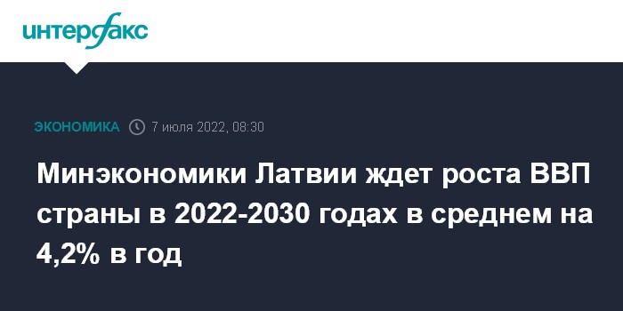 Москва. 7 июля. INTERFAX.RU -Министерство экономики Латвии прогнозирует экономический рост страны в 2022-2030 годах в среднем на уровне 4,2% в год, а в период 2031-2040 гг - в среднем на 3% в год, говорится в докладе ведомства о среднесрочных и долгосрочных прогнозах рынка труда.