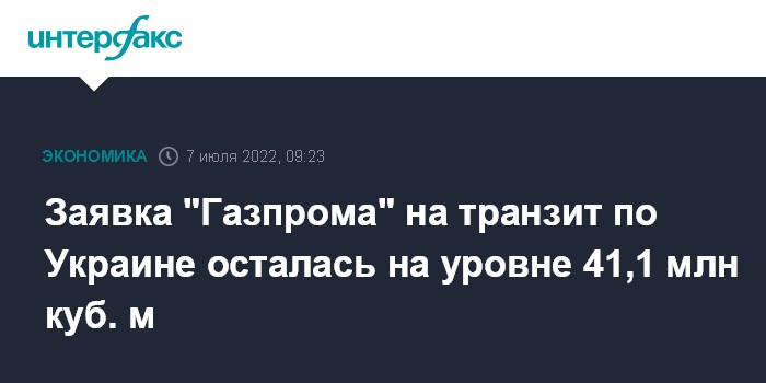 Москва. 7 июля. INTERFAX.RU - "Оператор ГТС Украины" принял от "Газпрома" заявку на транзит газа на четверг в объеме 41,1 млн кубометров, свидетельствуют данные украинской компании.