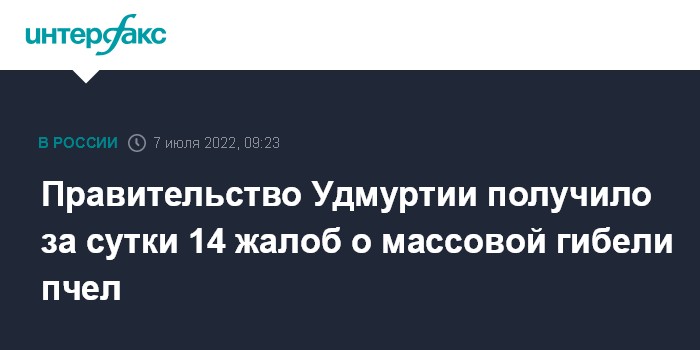 Москва. 7 июля. INTERFAX.RU - В администрацию Удмуртии за сутки поступили 14 жалоб пасечников о массовой гибели пчел, сообщила вице-премьер правительства республики Ольга Абрамова.