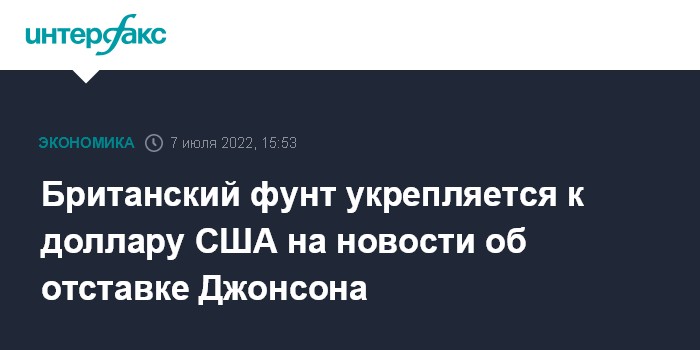 Москва. 7 июля. INTERFAX.RU - Британский фунт укрепляется к доллару США на торгах в четверг после объявления об уходе Бориса Джонсона с поста премьер-министра Великобритании.