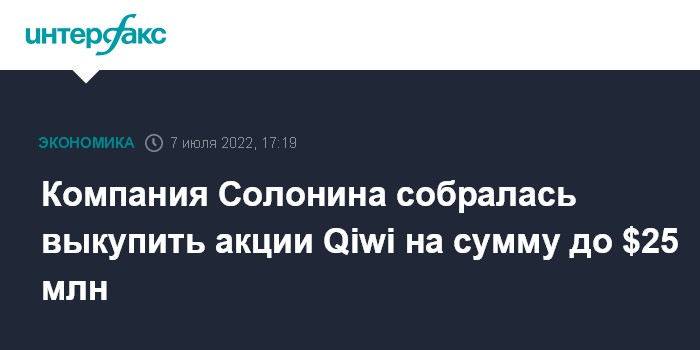 Москва. 7 июля. INTERFAX.RU - Компания Dalliance Services Company, подконтрольная основному владельцу Qiwi Сергею Солонину, готова выкупить акции Qiwi класса В и ее американские депозитарные расписки (ADR) на сумму до $25 млн (по текущему официальному курсу – 1,46 млрд рублей), следует из сообщения группы.