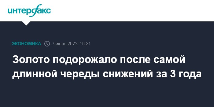 Москва. 7 июля. INTERFAX.RU - Цены на золото умеренно растут в четверг, восстанавливаясь после семи сессий падения подряд – это была самая длинная череда снижений за три года, пишет MarketWatch.