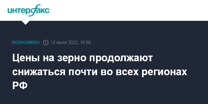 Москва. 12 июля. INTERFAX.RU - Цены на зерно в РФ на минувшей неделе, первой неделе нового сельхозгода, продолжили падение почти во всех регионах.