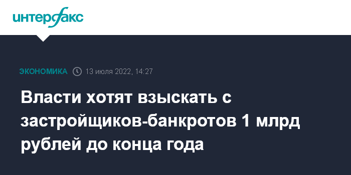 Москва. 13 июля. INTERFAX.RU - В России с обанкротившихся застройщиков жилья намерены взыскать до конца 2022 года около 1 млрд рублей, сообщил журналистам главный управляющий директор Фонда развития территорий Константин Тимофеев.