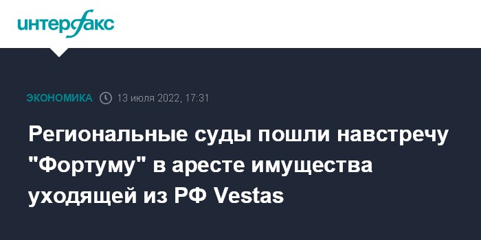 Москва. 13 июля. INTERFAX.RU - Региональные суды, в отличие от московского, начали поддерживать структуры ПАО "Фортум" в просьбах о принятии обеспечительных мер и аресте имущества датской Vestas в РФ, следует из материалов картотеки арбитража.