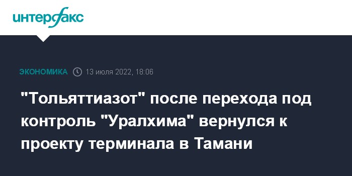 Москва. 13 июля. INTERFAX.RU - ПАО "Тольятттиазот" ("ТОАЗ"), перейдя под контроль "Уралхима", "оживило" проект строительства перевалочного комплекса на Тамани.