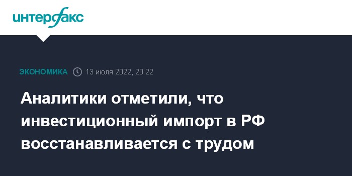 Москва. 13 июля. INTERFAX.RU - Импорт в РФ инвестиционных товаров, от доступности которых во многом зависят перспективы структурной перестройки экономики, пока восстанавливается с трудом, а внутренний рынок на данный момент не готов к полноценному замещению поставок из-за рубежа, пишут аналитики Банка России.