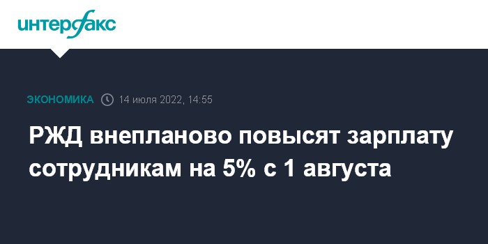 Москва. 14 июля. INTERFAX.RU - ОАО "РЖД" с 1 августа увеличит заработную плату сотрудникам на 5%, сообщила компания.