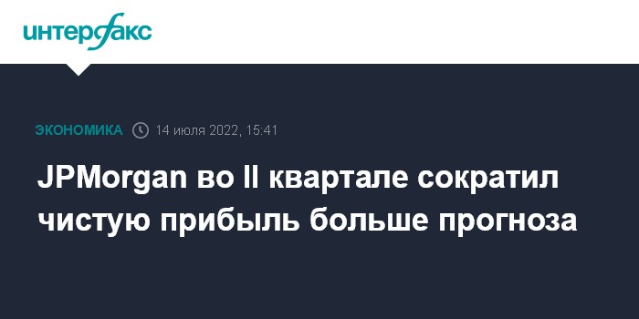 Москва. 14 июля. INTERFAX.RU - Крупнейший банк США по объему активов J.P. Morgan Chase & Co. во втором квартале 2022 года сократил чистую прибыль сильнее, чем ожидали аналитики.