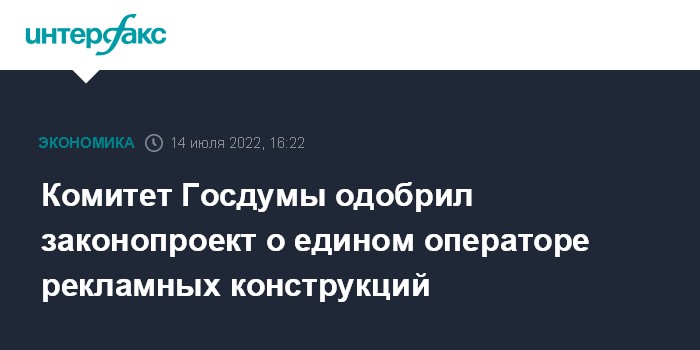 Москва. 14 июля. INTERFAX.RU - Комитет Госдумы по экономической политике поддержал законопроект о создании в России единого оператора, который будет координировать установку и содержание рекламных билбордов, а также координировать размещение электронных объявлений физических лиц на специализированных сайтах в интернете.