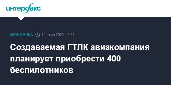 Москва. 14 июля. INTERFAX.RU - Авиакомпания, которую создают "Государственная транспортная лизинговая компания" (ГТЛК) и фонд поддержки проектов "Национальной технологической инициативы" (НТИ), до 2027 года планирует приобрести 400 беспилотных воздушных судов, говорится в презентации ГТЛК, с которой ознакомился "Интерфакс".