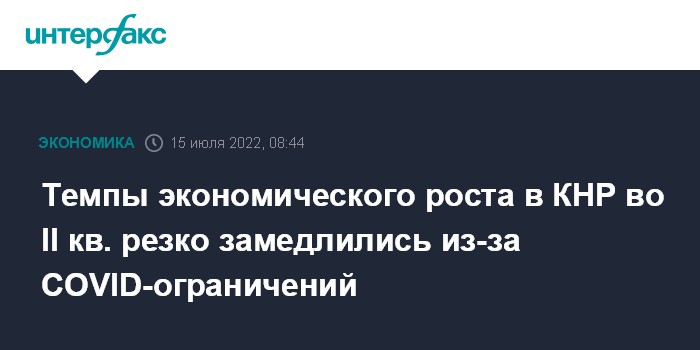 Москва. 15 июля. INTERFAX.RU - Темпы экономического роста в Китае во втором квартале 2022 года резко замедлились из-за карантинных ограничений, введенных властями страны для сдерживания очередной волны COVID-19.