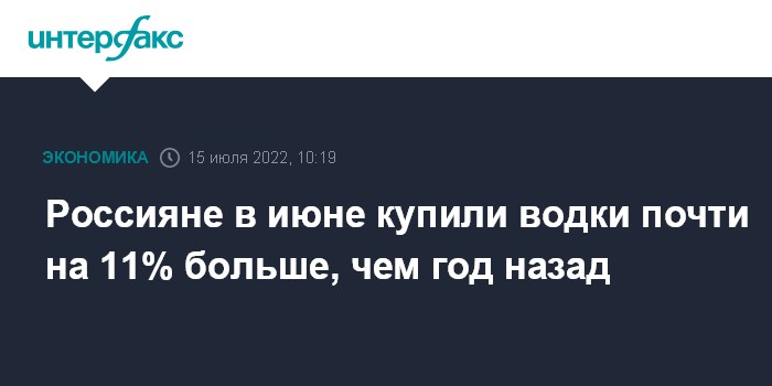 Москва. 15 июля. INTERFAX.RU - В России в июне 2022 года розничная продажа водки составила 6,05 млн декалитров (дал), что на 10,6% больше, чем годом ранее, сообщает Национальный союз защиты прав потребителей.