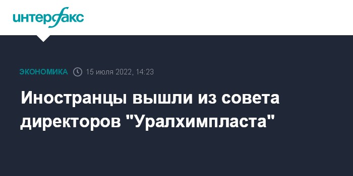 Москва. 15 июля. INTERFAX.RU - Три иностранца в совете директоров ПАО "Уралхимпласт" (крупный российский производитель синтетических смол) досрочно ушли в отставку, следует из сообщения компании.