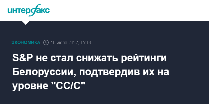 Москва. 16 июля. INTERFAX.RU - Международное рейтинговое агентство S&P Global Ratings пока не стало снижать рейтинги Белоруссии после попыток Минска выплатить купон по облигациям Belarus-27 в нацвалюте и подтвердило долгосрочные и краткосрочные рейтинги в иностранной валюте на уровне "CC/C" сохранив их в списке CreditWatch (на пересмотре) с "негативным" прогнозом.