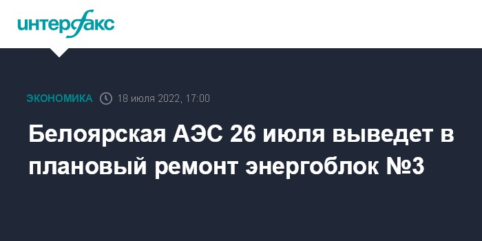 Москва. 18 июля. INTERFAX.RU - Энергоблок №3 Белоярской АЭС будет выведен в плановый ремонт 26 июля, говорится в телеграм-канале БАЭС.
