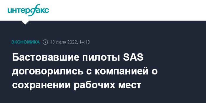 Москва. 19 июля. INTERFAX.RU - Пилоты скандинавской авиакомпании SAS AB в Швеции, Норвегии и Дании завершили забастовку, которая продолжалась 15 дней, поскольку достигли соглашения с руководством компании. Об этом сообщила пресс-служба перевозчика.