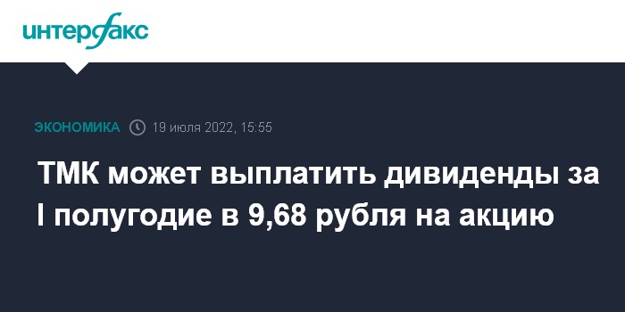Москва. 19 июля. INTERFAX.RU - ПАО "Трубная металлургическая компания" может выплатить дивиденды за первое полугодие 2022 года в размере 9,68 руб. на акцию. Об этом говорится в разделе "Сообщения о корпоративных действиях" на странице компании в системе раскрытия информации.