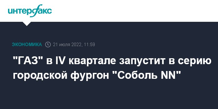 Москва. 21 июля. INTERFAX.RU - Группа "ГАЗ" запланировала на четвертый квартал 2022 года старт серийного производства автомобиля "Соболь NN", сообщила пресс-служба автопроизводителя.