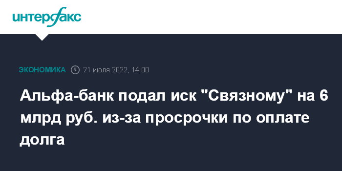 Москва. 21 июля. INTERFAX.RU - Альфа-банк намерен через суд взыскать с ритейлера "Связной" почти 6 млрд рублей из-за просрочки по погашению задолженности.