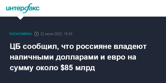 Москва. 22 июля. INTERFAX.RU - Население России владеет наличными долларами и евро на сумму около $85 млрд в эквиваленте, заявила глава ЦБ Эльвира Набиуллина на пресс-конференции в пятницу.