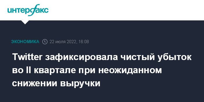 Москва. 22 июля. INTERFAX.RU - Американская Twitter Inc зафиксировала чистый убыток во втором квартале 2022 года на фоне неожиданного снижения выручки, которое она объяснила последствиями неопределенности в отношении сделки с Илоном Маском.