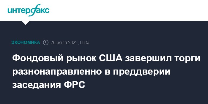 Москва. 26 июля. INTERFAX.RU - Американский фондовый рынок завершил торги понедельника без единой динамики в преддверии очередного заседания ФРС и публикации отчетностей крупнейших компаний страны.