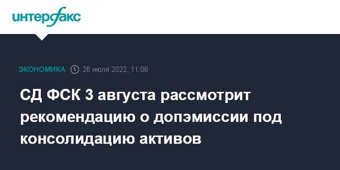 СД ФСК 3 августа рассмотрит рекомендацию о допэмиссии под консолидацию активов