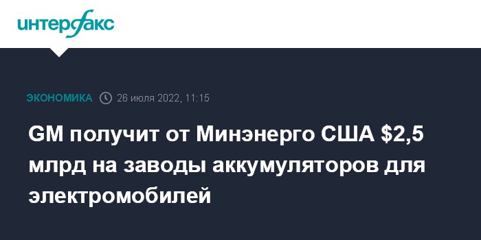 Москва. 26 июля. INTERFAX.RU - Министерство энергетики США предоставит совместному предприятию американского автомобильного концерна General Motors Co и южнокорейской LG Energy Solution $2,5 млрд для финансирования строительства трех заводов по производству аккумуляторных батарей для электромобилей.